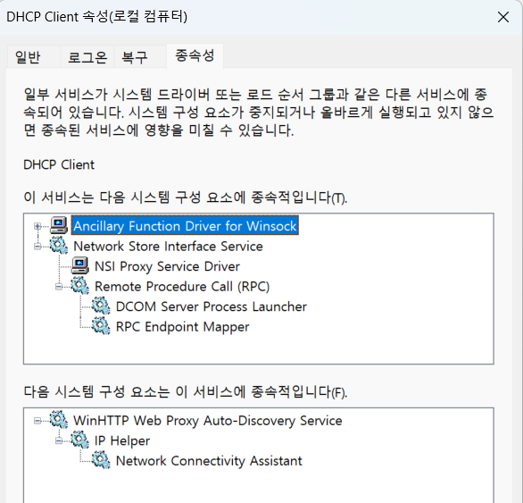 Services.msc 를 확인해보니, DHCP Client는 Network에 관한 서비스에 종속되어 있다.