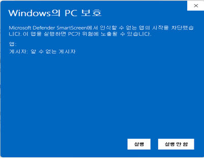 아래와 같이 "SmartScreen"에서 앱의 시작을 1차적으로 차단하지만, 사용자의 선택하에 실행할 수 있도록 화면이 출력된다.